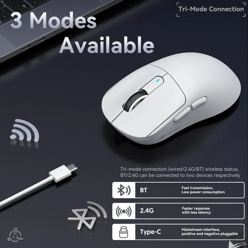 - In order to meet the needs of different scenarios, the X3 high-performance mouse is equipped with a BK3633 chip, providing three different connection modes, wired USB-C, 2.4GHz and Bluetooth mode, which can be easily switched through the button on the back of the mouse.
